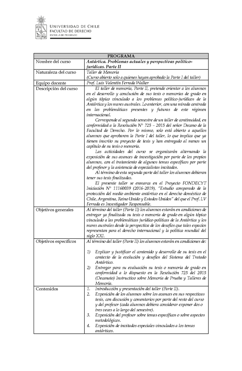 D129T07686-1 Taller Antártica. Problemas Actuales y perspectivas político-jurídicas. Parte II 2019, Segundo Semestre