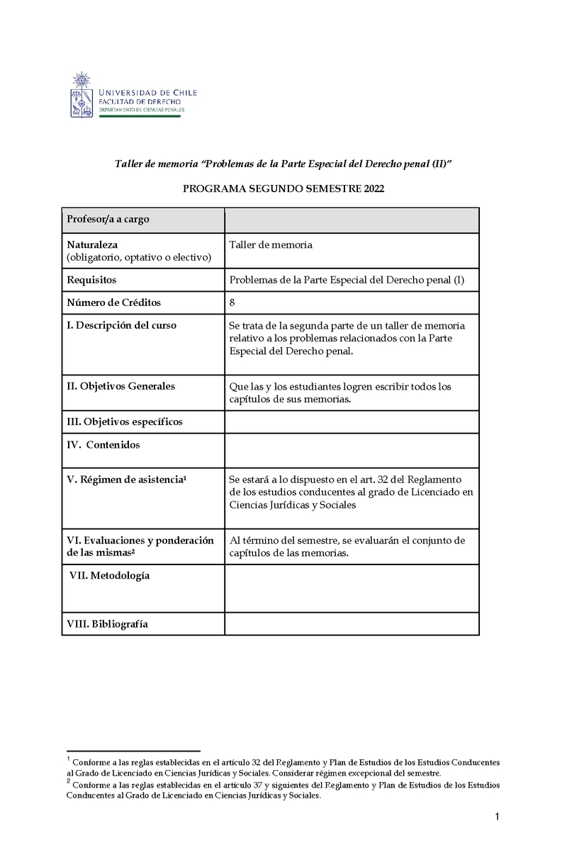 D125T07967-1 Taller Problemas de la Parte Especial del Derecho Penal. Parte II 2022, Segundo Semestre