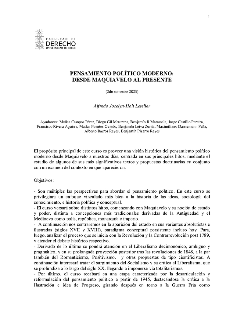 D121B0310G-1 Pensamiento Político Moderno, desde Maquiavelo hasta el presente 2023, Segundo Semestre