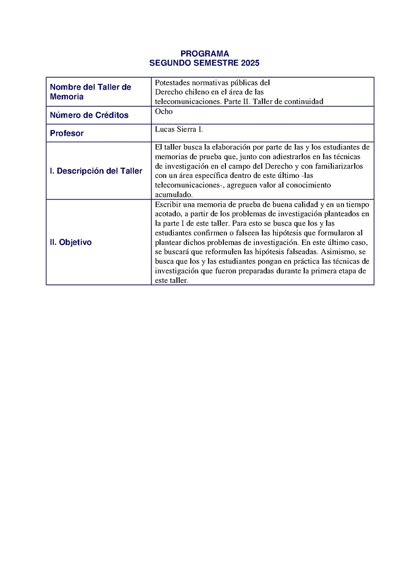 D121T071135-1 Taller Potestades normativas públicas del Derecho chileno en el área de las telecomunicaciones. Parte II 2025, Segundo Semestre