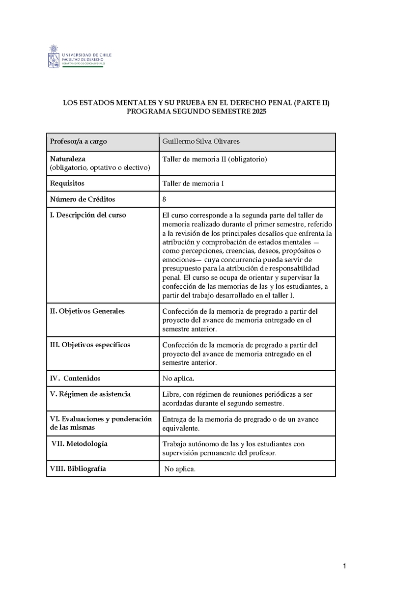 D125T071117-1 Taller Los estados mentales y su prueba en el Derecho Penal. Parte II 2025, Segundo Semestre