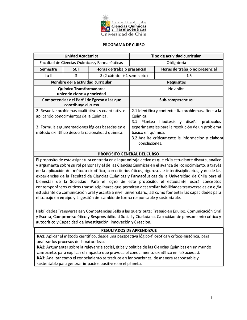 | Descripción | La química está en todas partes: en el aire que respiramos, los materiales que usamos, los productos que consumimos y es fundamental para enfrentar los desafíos más urgentes que enfrentamos como sociedad, como la emergencia climática. Pero, ¿Cómo podemos aprovechar su potencial para construir un futuro más sostenible y justo? ¿Cuál es el rol de nosotros como futuros profesionales en usar el conocimiento de forma responsable, innovadora y sostenible? Este curso invita a descubrir la importancia de las ciencias químicas y sus profesiones, explorando su impacto en la tecnología, la salud y el medio ambiente. A través de debates, estudios de caso y aprendizaje activo, los estudiantes analizarán cómo el conocimiento químico impulsa la innovación, resuelve problemas globales y genera cambios en nuestra vida cotidiana. Desde el método científico hasta la ética en la investigación, pasando por la sustentabilidad, sistemas de innovación y la ciencia ciudadana, esta asignatura desafía a pensar críticamente sobre el rol de las ciencias en un mundo en constante transformación. Además, fortalece habilidades clave como la argumentación, la ciudadanía científica y el trabajo en equipo, esenciales para cualquier desempeño profesional, ya sea en el laboratorio, la industria, el estado u otros emprendimientos. Este curso es una oportunidad para mirar la química con otros ojos, desarrollar herramientas académicas para conectar la ciencia con la sociedad y descubrir cómo cada uno/a, como investigadores/as, puede ser parte de soluciones para un país mejor. |