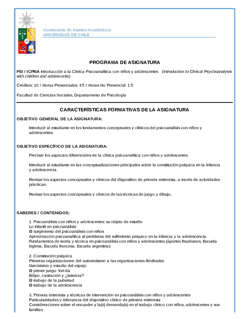 PSI-ICPNA-1 Introducción a la Clínica Psicoanalítica con Niños y Adolescentes 2013, Segundo Semestre