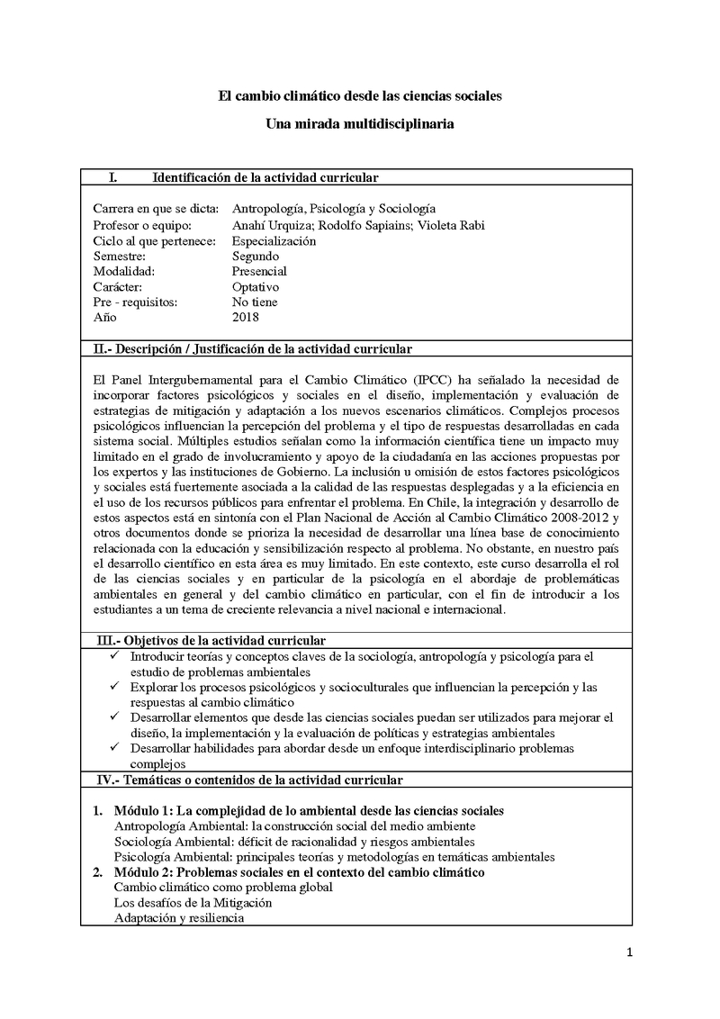 AN01161-1 El cambio climático desde las Ciencias Sociales. Una mirada multidisciplinaria 2018, Segundo Semestre
