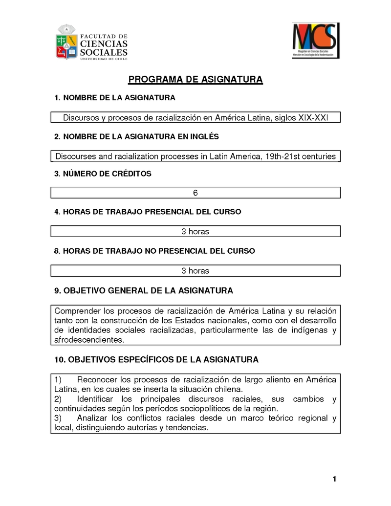 MCS7134-1 Electivo: Discursos y Procesos de Racialización en América Latina, Siglos XIX - XXI 2018, Segundo Semestre