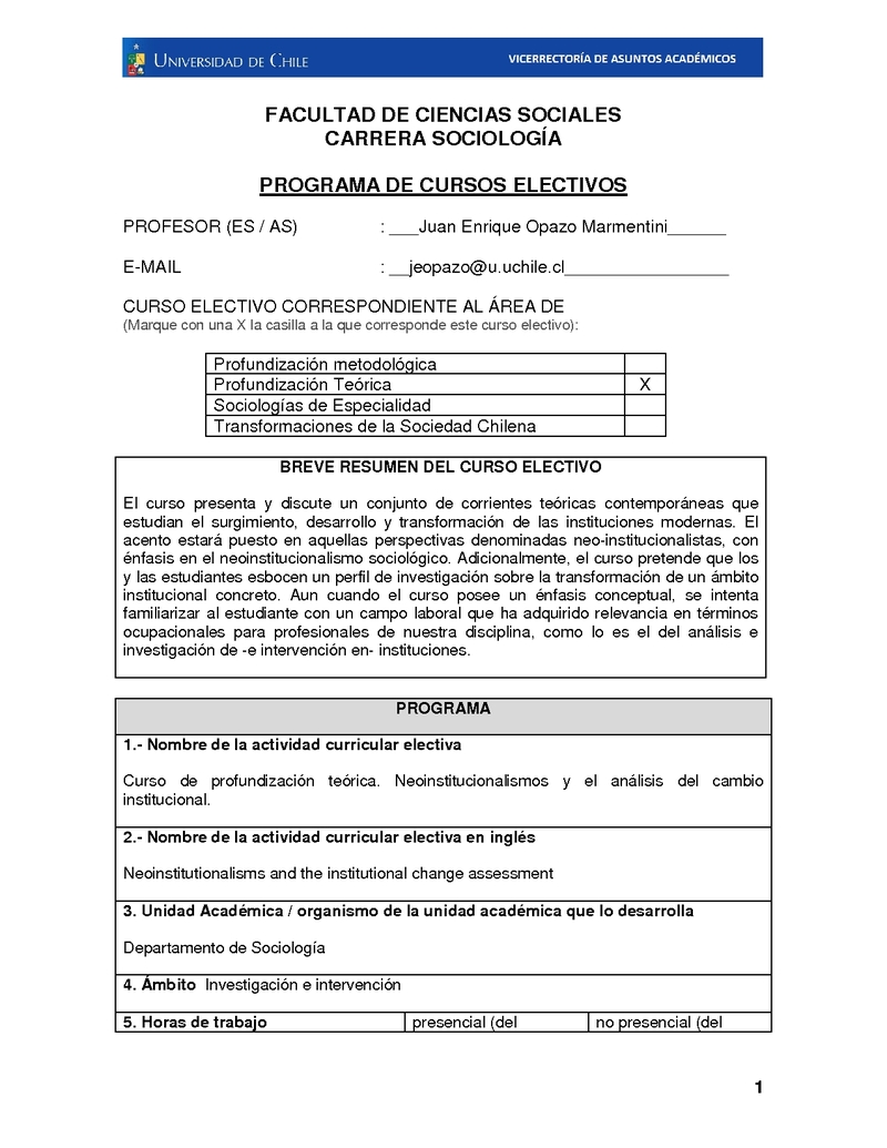 SOC01056-1 Electivo de Profundización Teórica - Neoinstitucionalismo y Análisis Institucional: Elementos para un Enfoque Teórico Aplicado 2019, Segundo Semestre