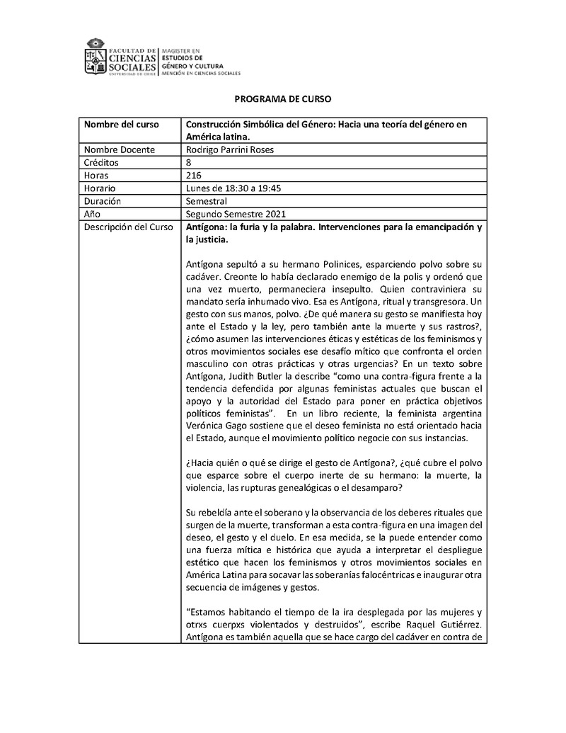 MEGC0400-1 Construcción Simbólica del Género: Hacia una teoría del Género en América Latina 2021, Segundo Semestre