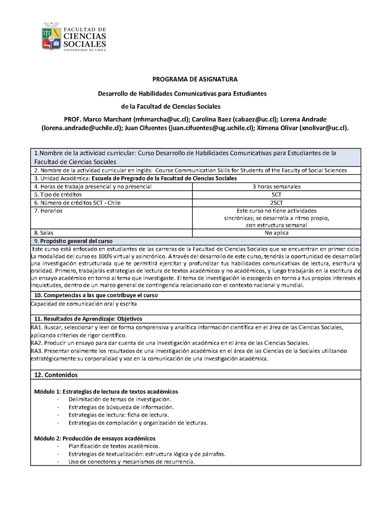 TRNSV0007-1 Desarrollo de Habilidades Comunicativas para Estudiantes de la Facultad de Ciencias Sociales 2022, Segundo Semestre