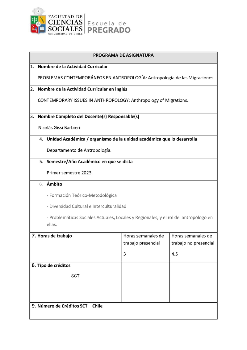 ANT00028-1 Problemas Contemporáneos de la Antropología: Antropología de las Migraciones 2023, Primer Semestre