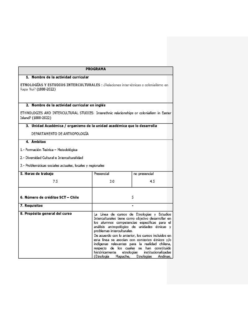 ANT00070-1 Etnología y Estudios Interculturales II: ¿Relaciones inter-étnicas o colonialismo en Rapa Nui? (1888-2020) 2023, Segundo Semestre