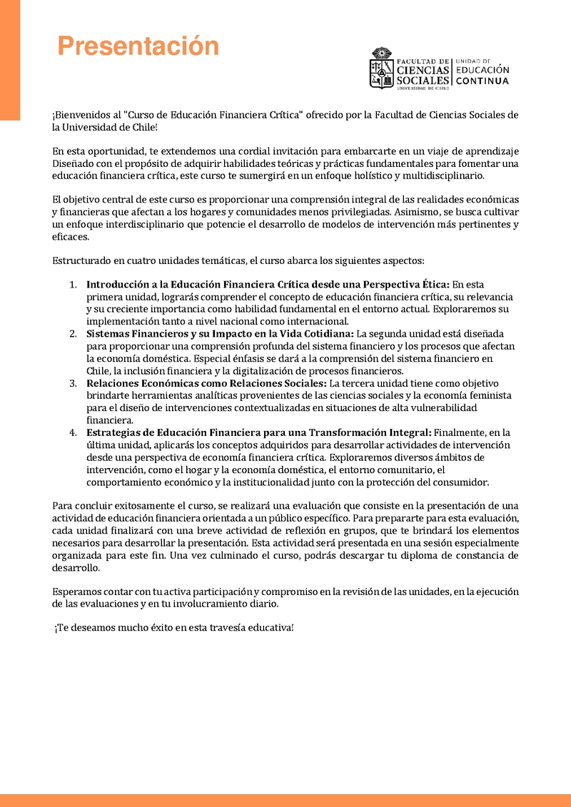 | Descripción | Te damos la bienvenida al Curso de Educación Financiera Crítica que comenzará el día 21 de septiembre. Mientras tanto, te invitamos a conocer la plataforma virtual y responder el formulario de deberes y derechos del estudiante. Formulario de Deberes y Derechos del Estudiante |