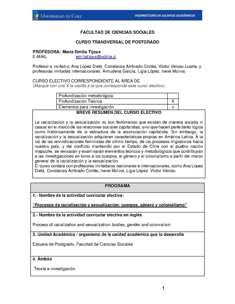POSTG0017-1 Procesos de racialización y sexualización: cuerpos, género y colonialismo 2023, Segundo Semestre