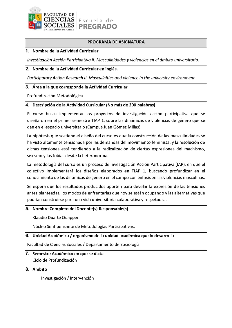 SOC01134-1 Electivo de Profundización Metodológica - Investigación Acción Participativa II. Masculinidades y Violencias en el Ámbito Universitario 2023, Segundo Semestre