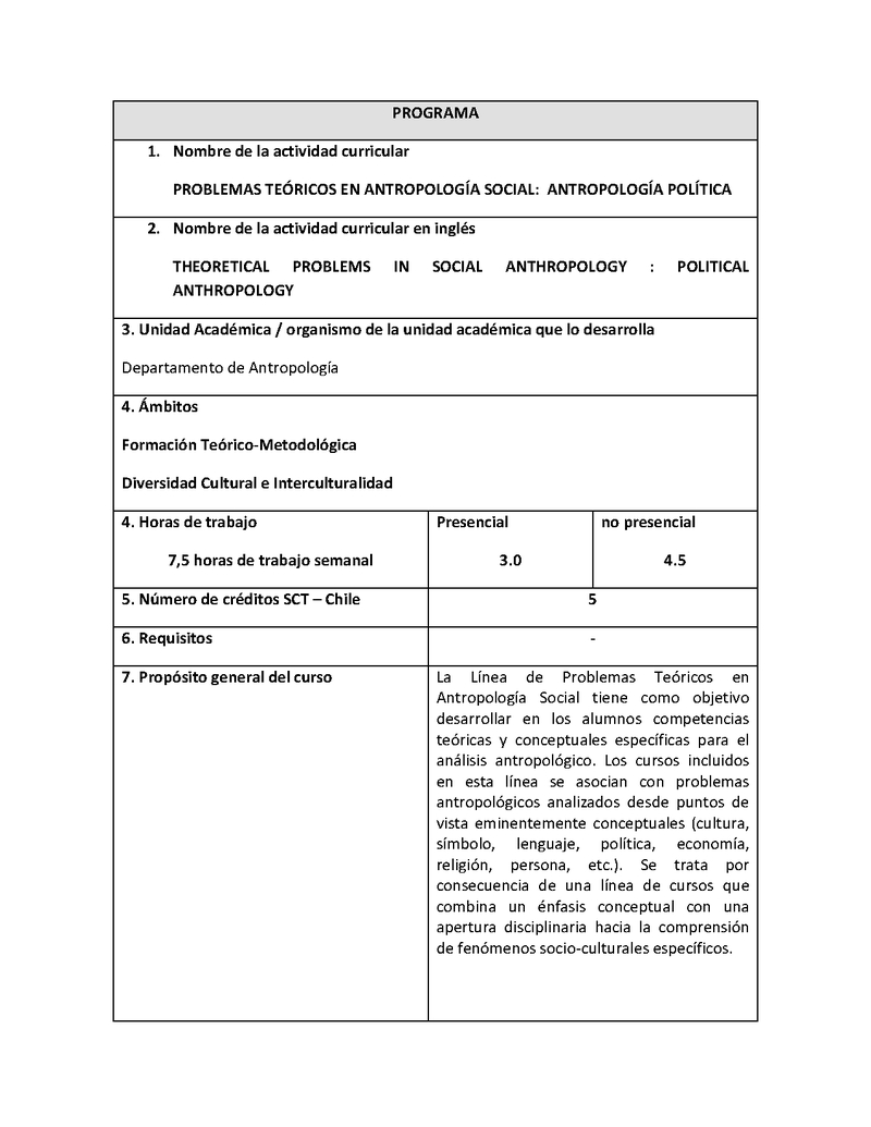 ANT00099-1 Problemas Teóricos en Antropología Social I: Antropología Política 2024, Segundo Semestre