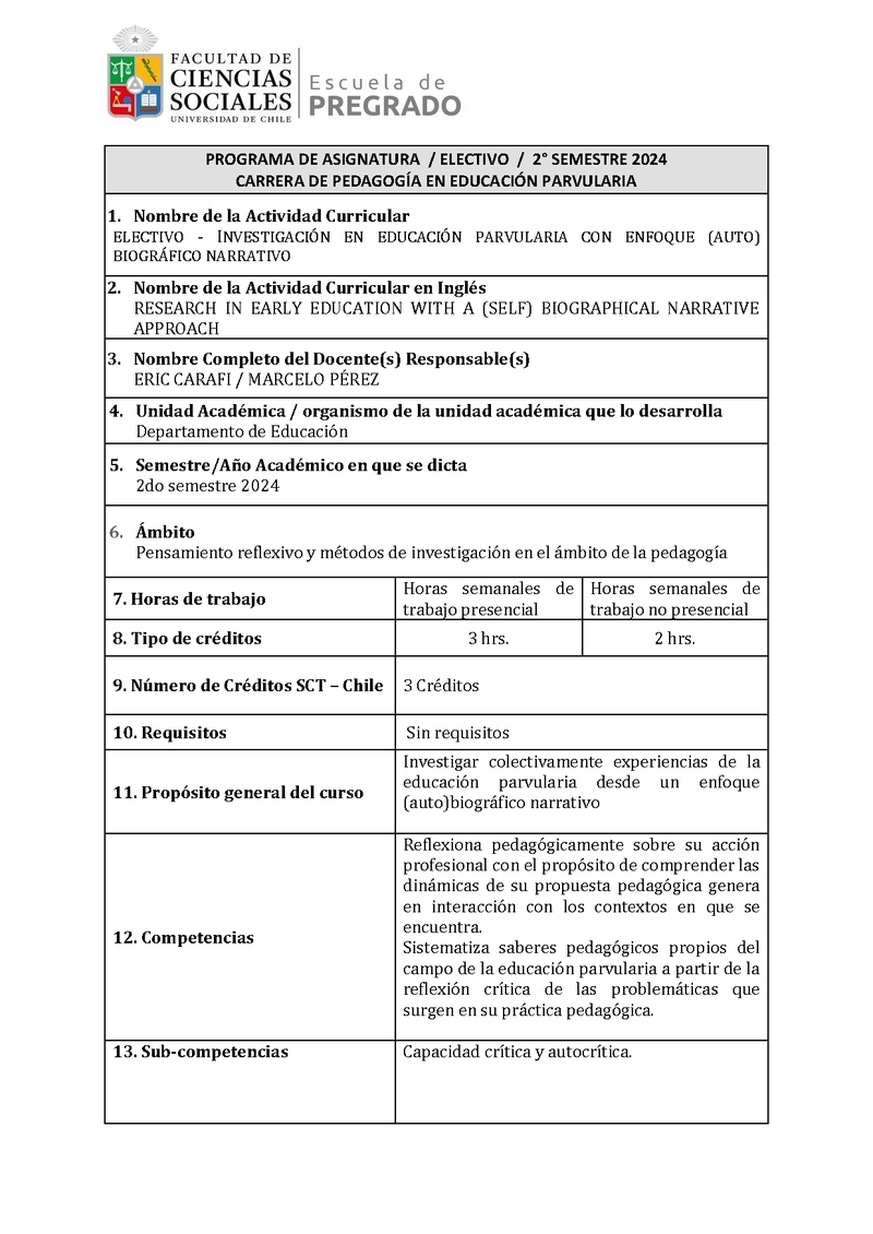 PV00088-1 Electivo de título: Investigación en educación parvularia con un enfoque (auto) biográfico narrativo 2024, Segundo Semestre