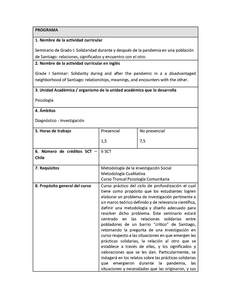 PSISG82-1 Seminario de Grado 1 Solidaridad Durante y Después de la Pandemia en una Población de Santiago: Relaciones, Significados y Encuentro con el Otro. 2025, Primer Semestre