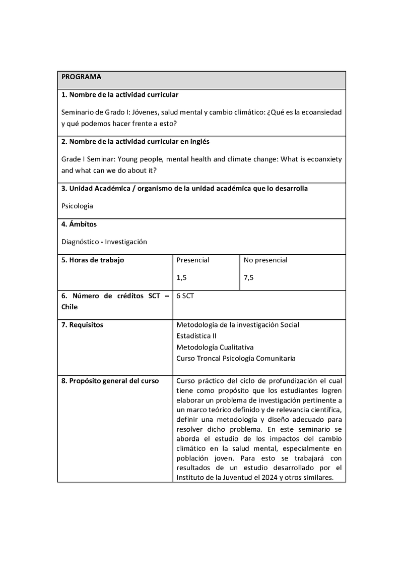 PSISG85-1 Seminario de Grado 1 Jóvenes, Salud Mental y Cambio Climático: ¿Qué es la Ecoansiedad y qué Podemos hacer frente a esto? 2025, Primer Semestre