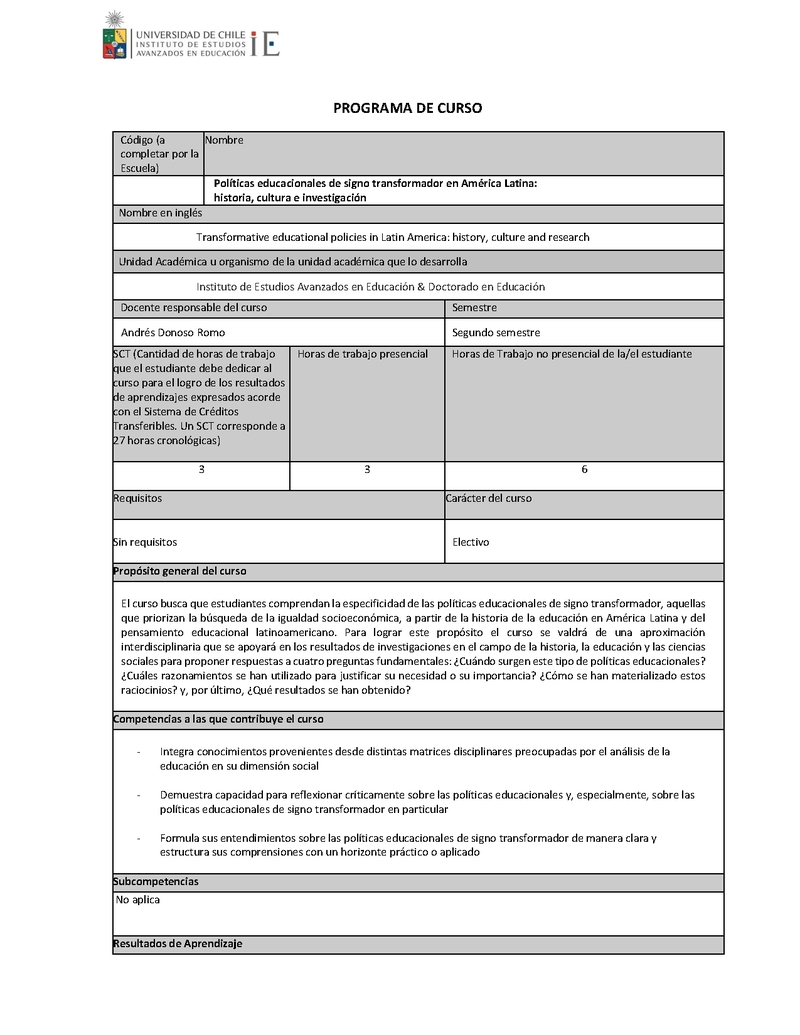 DOEDUE11-1 Electivo: Políticas educacionales de signo transformador en América Latina: historia, cultura e investigación 2025, Segundo Semestre