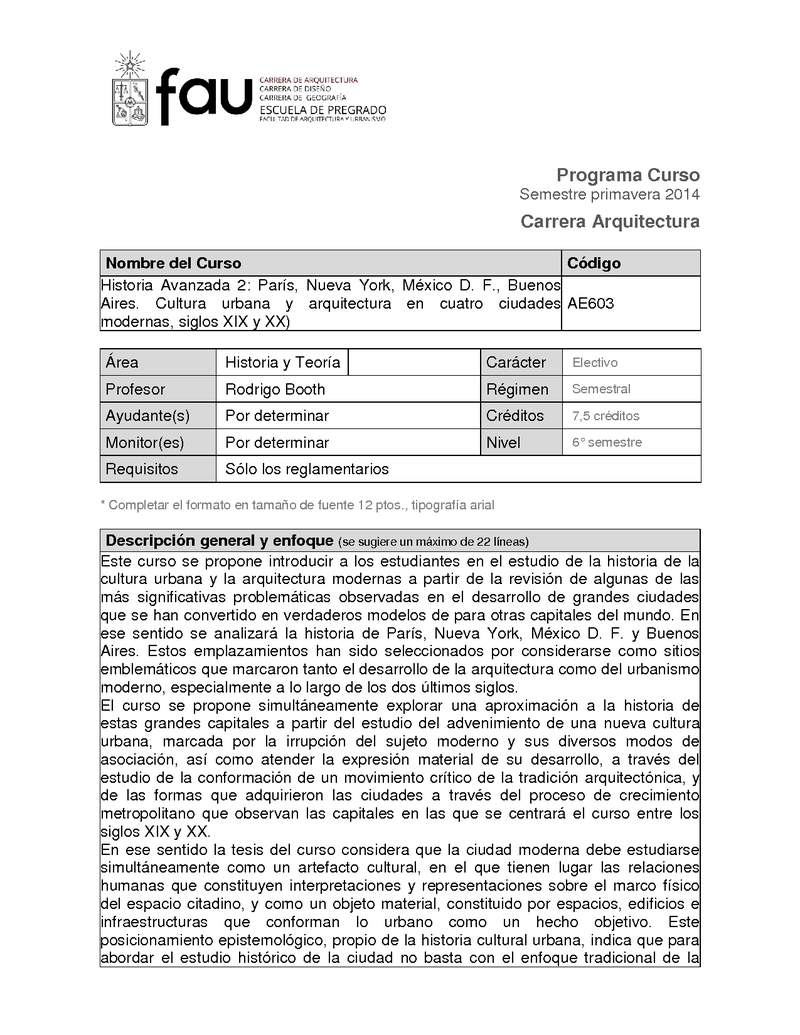 AE603-4-1 Cultura urbana y arquitectónica en cuatro ciudades modernas (París, NY, México, Bs Aires) 2014, Segundo Semestre