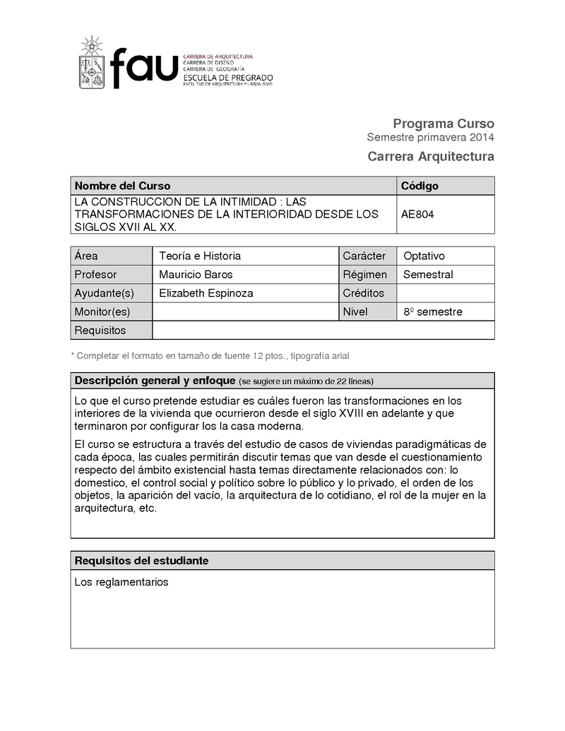 AE804-10-1 La construcción de la intimidad: Las transformaciones del interior desde los siglos XVII al XX 2014, Segundo Semestre
