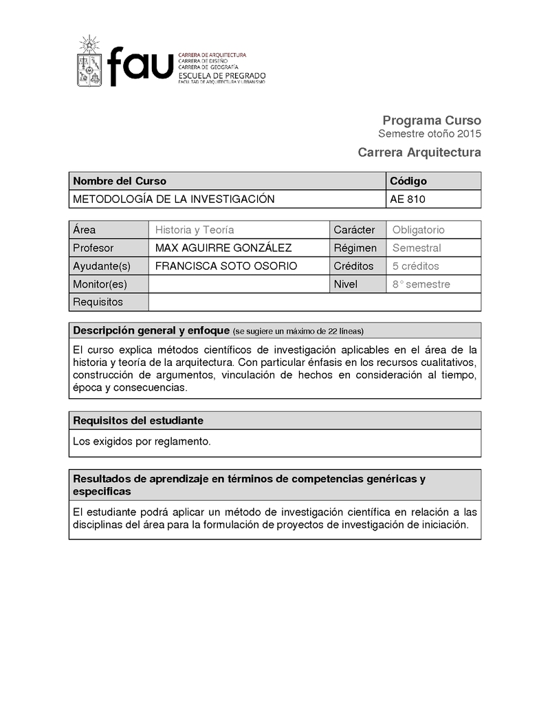 | Descripción | El curso está diseñado para ayudar a los estudiantes a aprender las habilidades, sensibilidades y comprensión necesarias para transformarse en un buen investigador en temas de planificación y estudios urbanos. Durante la primera mitad del curso, se mostrarán una variedad de estrategias de diseño de investigación, y las metodologías y técnicas asociadas, a partir de las cuales los estudiantes desarrollarán una propuesta de investigación que refleje sus propios intereses. En una segunda parte, se trabajará en base a un modelo de tutorías colaborativas, poniendo énfasis en la coherencia lógica del Seminario de Investigación (escritura y argumentación científica), y en los dispositivos de producción de información. | |