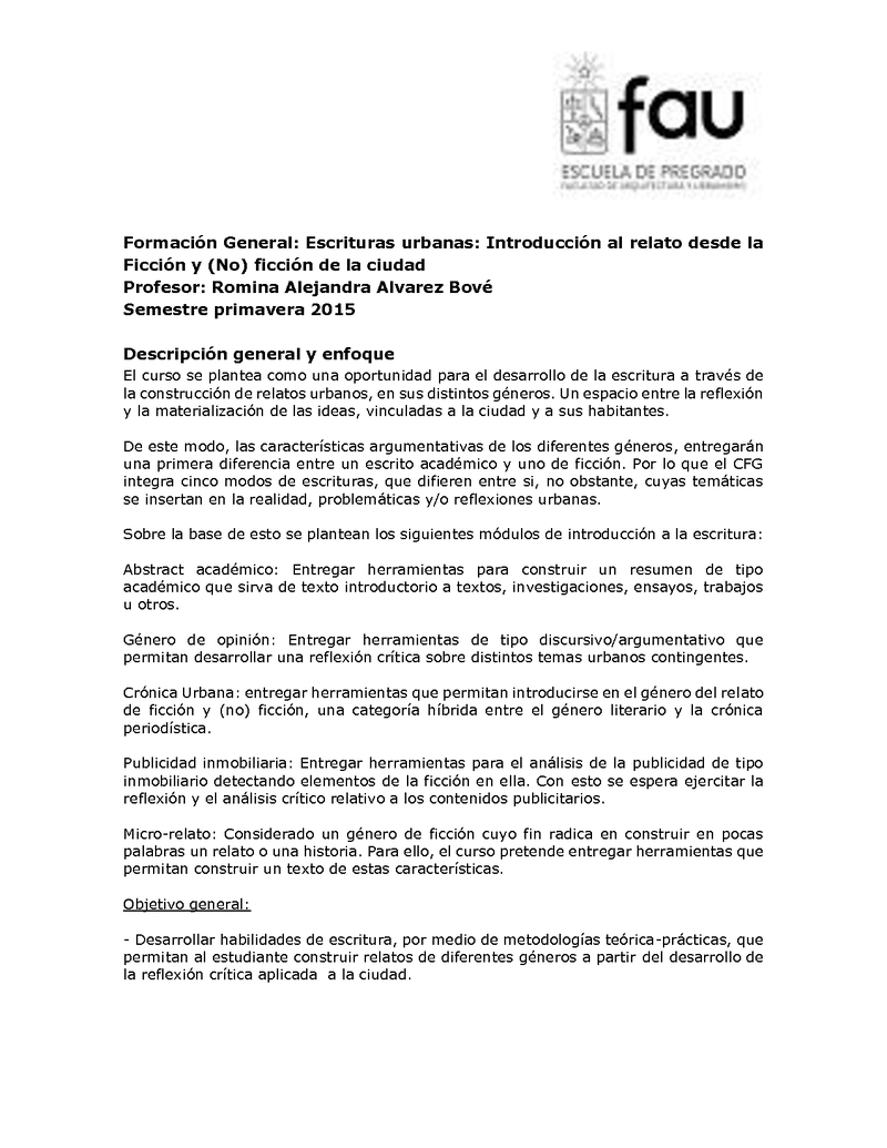 FGARQ128-1 Escrituras urbanas: Introducción al relato desde la (NO) ficción de la ciudad 2015, Segundo Semestre
