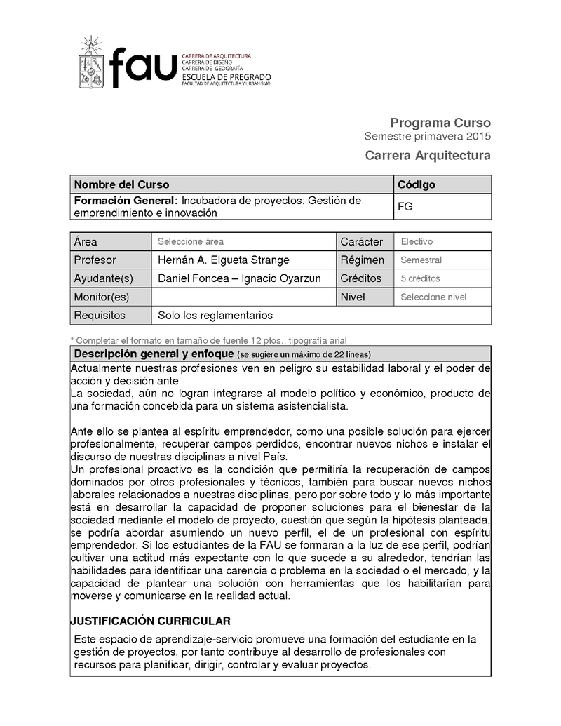 FGARQ130-1 Incubadora de proyectos: Gestión de emprendimiento e innovación 2015, Segundo Semestre