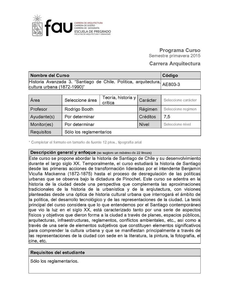 AE8033-1 Santiago de Chile: Política, arquitectura, cultura urbana (1872-1990) 2016, Segundo Semestre
