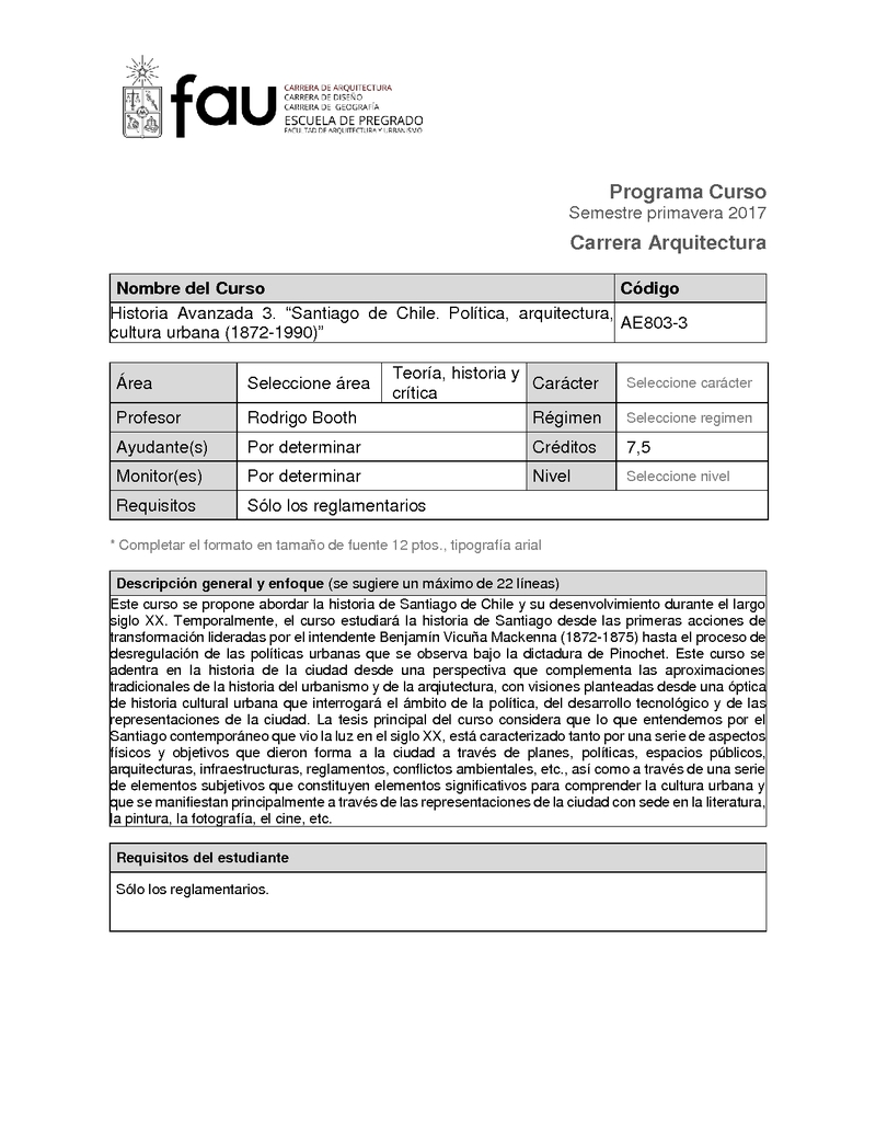 AE8033-2 Santiago de Chile: Política, arquitectura, cultura urbana (1872-1990) 2018, Primer Semestre