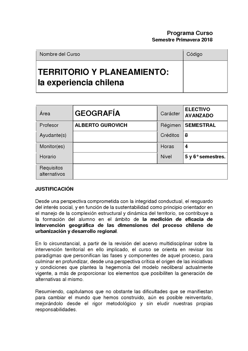 AUG60007-1 Electivo de especialización: Territorio y Planeamiento: la experiencia Chilena 2018, Segundo Semestre