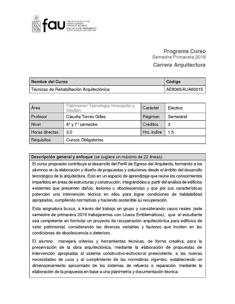 AUA60015-1 Electivo de especialización: Técnicas de rehabilitación estructural 2019, Segundo Semestre