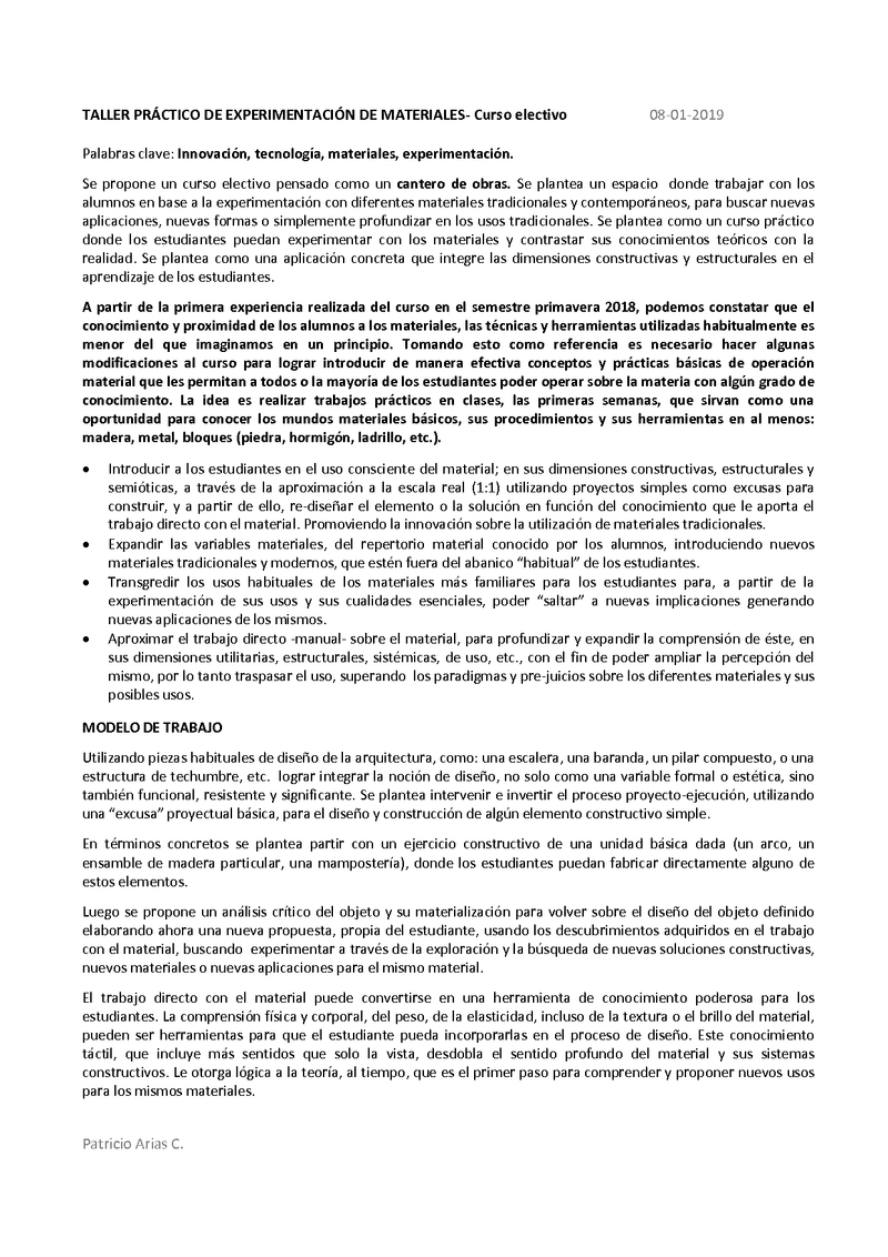 AUA60038-1 Electivo de especialización: Taller práctico de experimentación de materiales 2019, Segundo Semestre