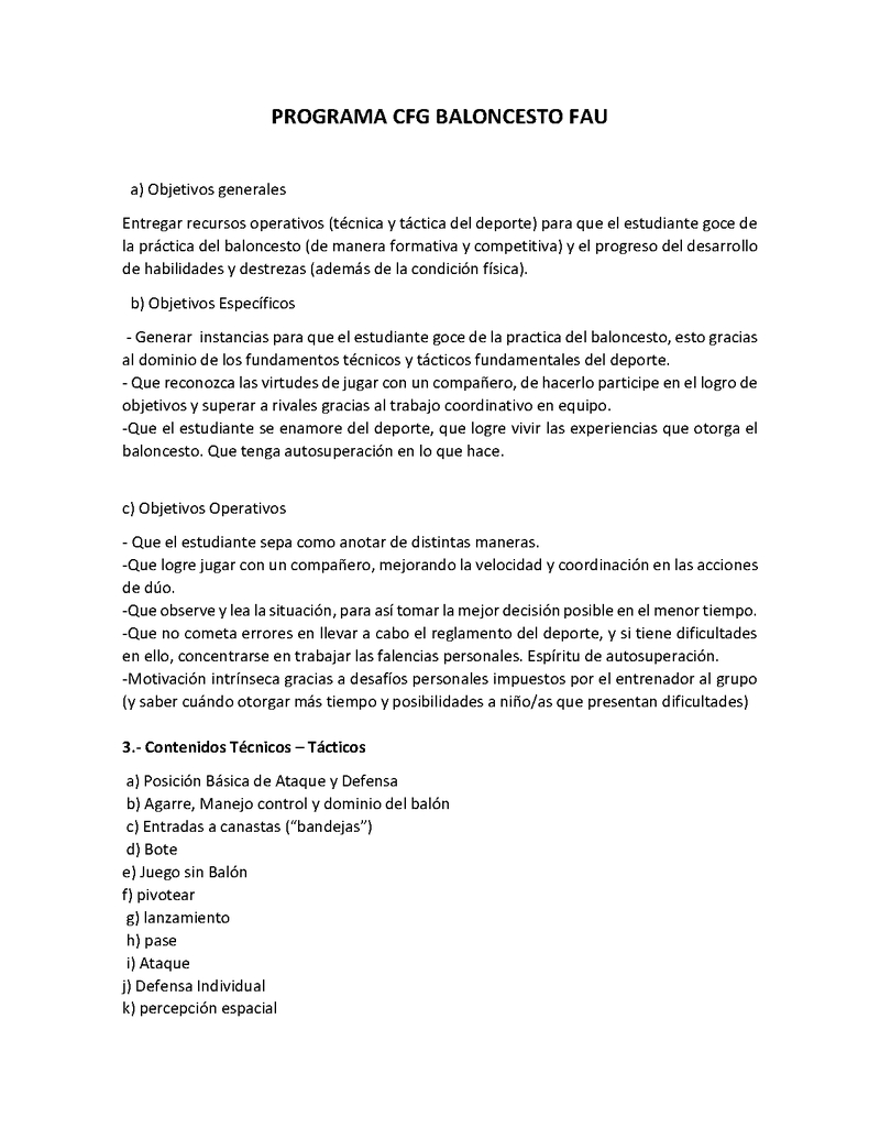 | Descripción | PROGRAMA CFG BALONCESTO FAU a) Objetivos generales Entregar recursos operativos (técnica y táctica del deporte) para que el estudiante goce de la práctica del baloncesto (de manera formativa y competitiva) y el progreso del desarrollo de habilidades y destrezas (además de la condición física). b) Objetivos Específicos - Generar instancias para que el estudiante goce de la practica del baloncesto, esto gracias al dominio de los fundamentos técnicos y tácticos fundamentales del deporte. - Que reconozca las virtudes de jugar con un compañero, de hacerlo participe en el logro de objetivos y superar a rivales gracias al trabajo coordinativo en equipo. -Que el estudiante se enamore del deporte, que logre vivir las experiencias que otorga el baloncesto. Que tenga autosuperación en lo que hace. c) Objetivos Operativos - Que el estudiante sepa como anotar de distintas maneras. -Que logre jugar con un compañero, mejorando la velocidad y coordinación en las acciones de dúo. -Que observe y lea la situación, para así tomar la mejor decisión posible en el menor tiempo. -Que no cometa errores en llevar a cabo el reglamento del deporte, y si tiene dificultades en ello, concentrarse en trabajar las falencias personales. Espíritu de autosuperación. -Motivación intrínseca gracias a desafíos personales impuestos por el entrenador al grupo (y saber cuándo otorgar más tiempo y posibilidades a niño/as que presentan dificultades) 3.- Contenidos Técnicos – Tácticos a) Posición Básica de Ataque y Defensa b) Agarre, Manejo control y dominio del balón c) Entradas a canastas (“bandejas”) d) Bote e) Juego sin Balón f) pivotear g) lanzamiento h) pase i) Ataque j) Defensa Individual k) percepción espacial 4.- metodología: Cada contenido técnico-táctico tendrá su juego adaptado que desarrolle dicho fundamento. El entrenador realizará diversos estímulos relámpago para una rápida adaptación y concentración del estudiante a diversos problemas que se presentan en la práctica deportiva. Se realizará de lo simple a lo complejo, demostrándole al grupo que todos pueden realizarlo. Todos realizan todo, aun no hay especialización en los roles deportivos. 5.- Evaluaciones : a) Lanzamiento y Bandeja b) pick ´n´ roll (en ataque y defensa) c) fundamento táctico ofensivo (5 abiertos) d) asistencia e) asistir al entrenamiento de la selección (opcional y/o recuperativa) |