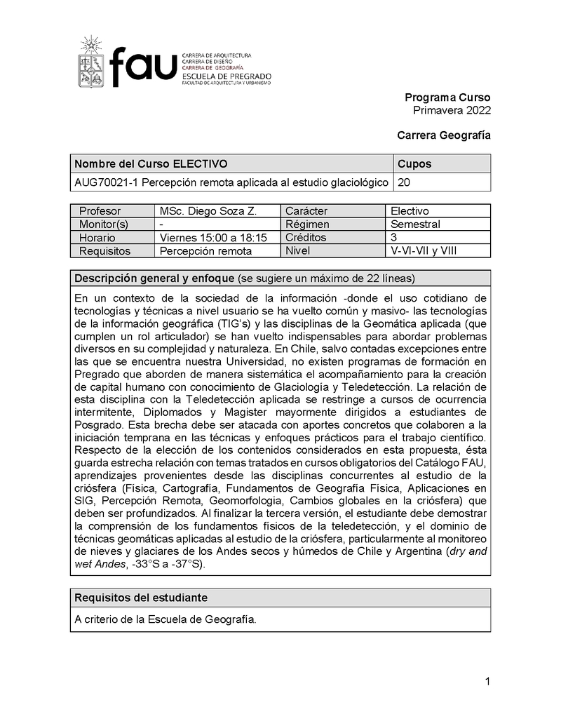 AUG70021-1 Electivo de especialización: Percepción remota aplicada al estudio glaciológico 2022, Segundo Semestre