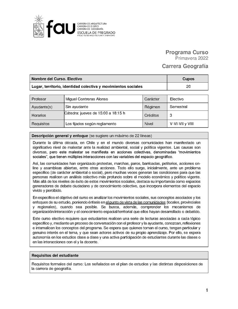 AUG70026-1 Electivo de especialización: Lugar, territorio, identidad colectiva y movimientos sociales 2022, Segundo Semestre