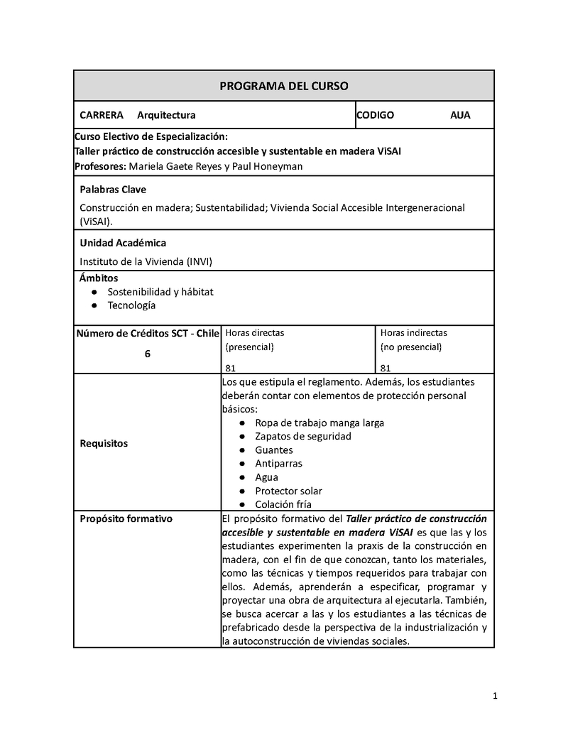 AUA70077-1 Electivo de especialización: Taller práctico de construcción accesible y sustentable en madera ViSAI 2022, Tercer Semestre