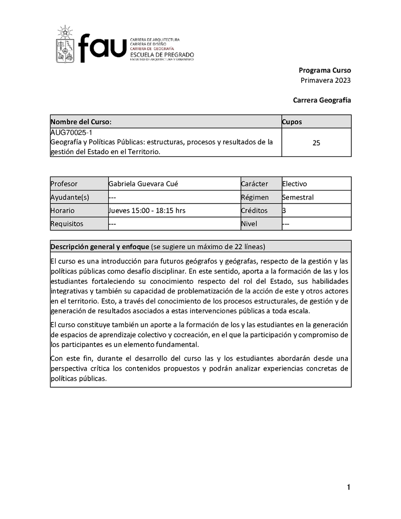 AUG70025-1 Electivo de especialización: Geografía y Políticas Públicas: estructuras, procesos y resultados de la gestión del Estado en el Territorio 2023, Primer Semestre