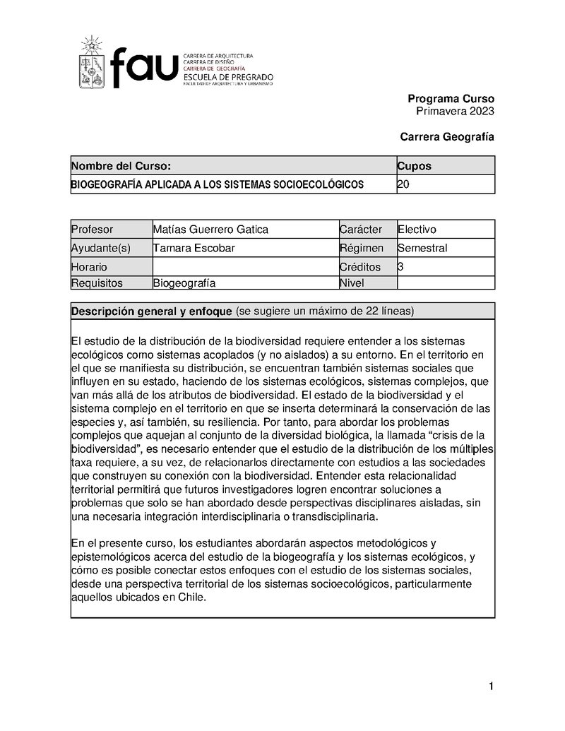 AUG50073-1 Electivo de Especialización: Biogeografía aplicada a los sistemas socio-ecológicos 2023, Segundo Semestre