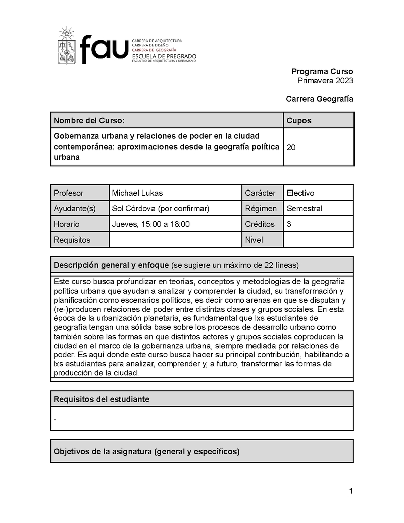 AUG70032-1 Electivo de Especialización: Gobernanza urbana y relaciones de poder en la ciudad contemporánea: aproximaciones desde la geografía política urbana 2023, Segundo Semestre