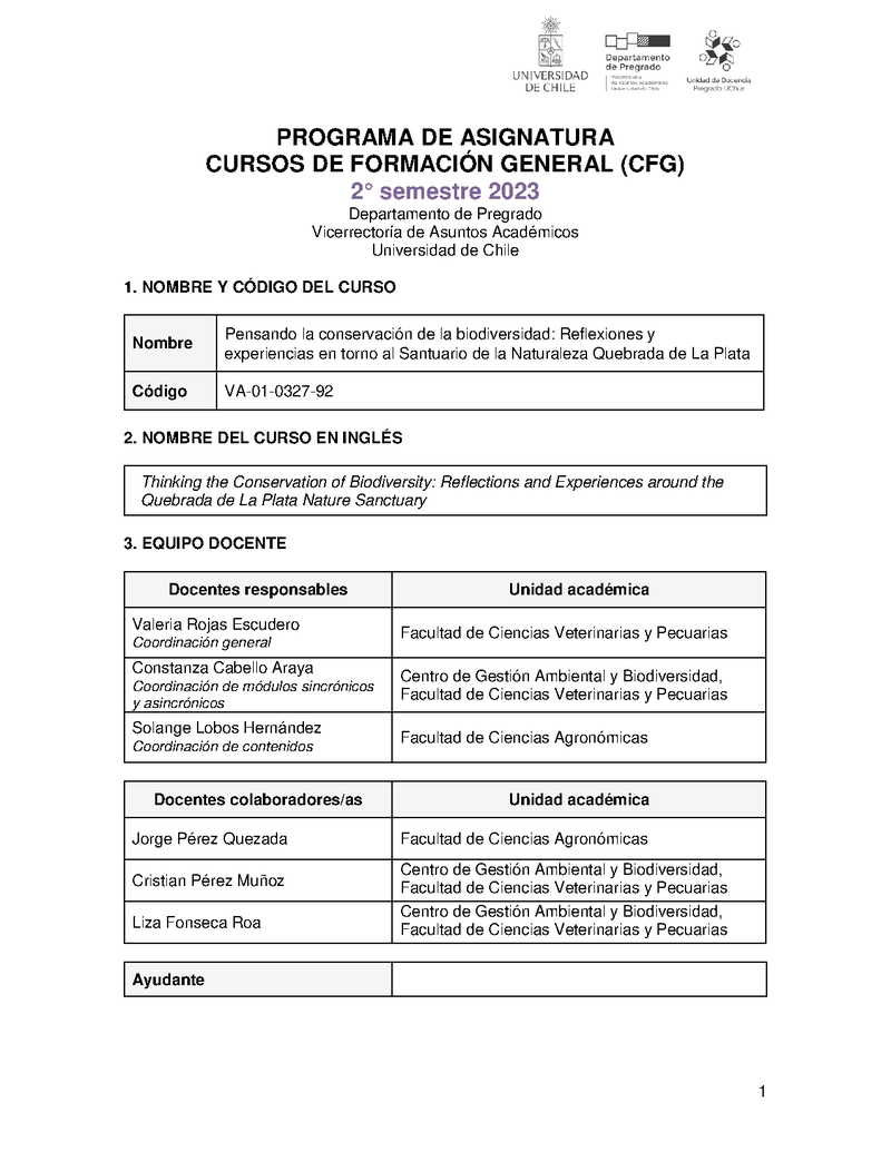 VA-01-0327-92-1 Pensando la Conservación de la Biodiversidad: Reflexiones y Experiencias en Torno al Santuario de la Naturaleza Quebrada de la Plata 2023, Segundo Semestre