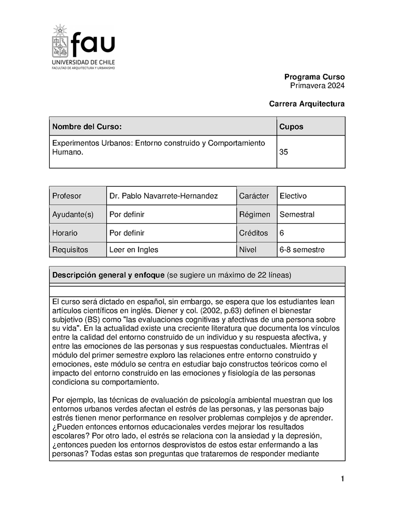 AUA60122-1 Electivo de especialización: Experimentos Urbanos: Estudios de Impacto del Entono Construido en el Comportamiento Humano 2024, Segundo Semestre