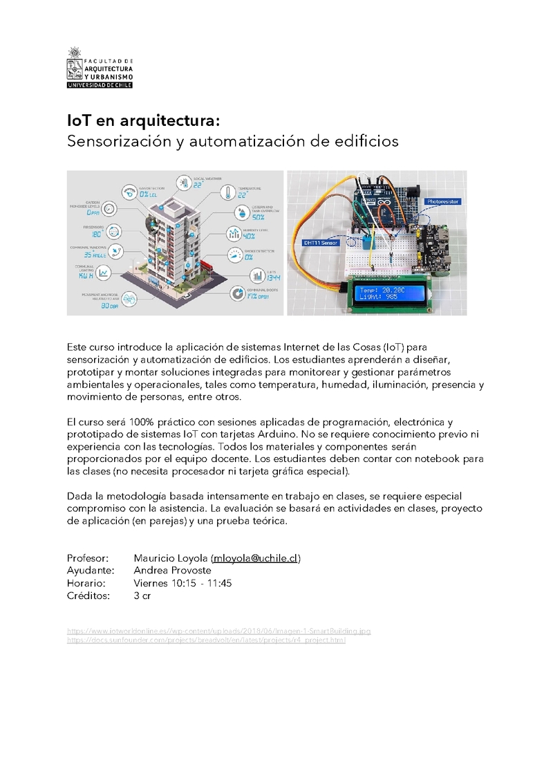 Descripción Este curso introduce la aplicación de sistemas Internet de las Cosas (IoT) para sensorización y automatización de edificios. Los estudiantes aprenderán a diseñar, prototipar y montar soluciones integradas para monitorear y gestionar parámetros ambientales y operacionales, tales como temperatura, humedad, iluminación, presencia y movimiento de personas, entre otros.
