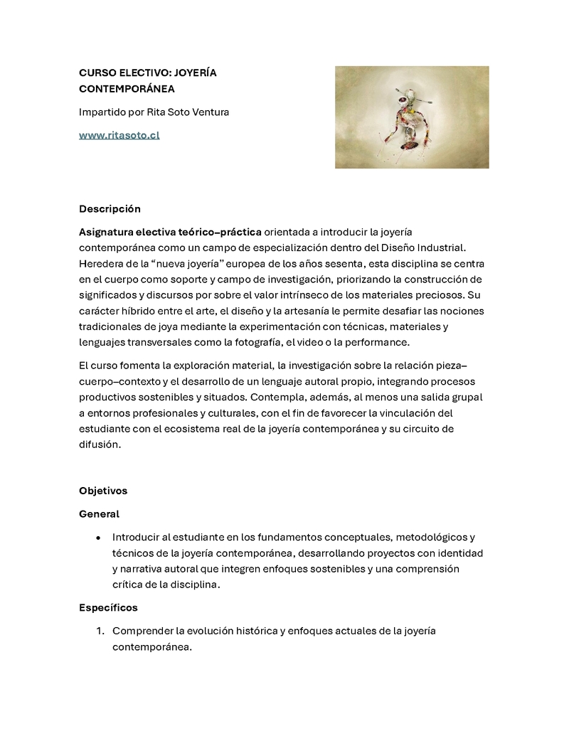 | Descripción | CURSO ELECTIVO | JOYERÍA CONTEMPORÁNEA El curso fomenta la exploración material, la investigación sobre la relación pieza–cuerpo–contexto y el desarrollo de un lenguaje autoral propio, integrando procesos productivos sostenibles y situados. Contempla, además, al menos una salida grupal a entornos profesionales y culturales, con el fin de favorecer la vinculación del estudiante con el ecosistema real de la joyería contemporánea y su circuito de difusión. | |