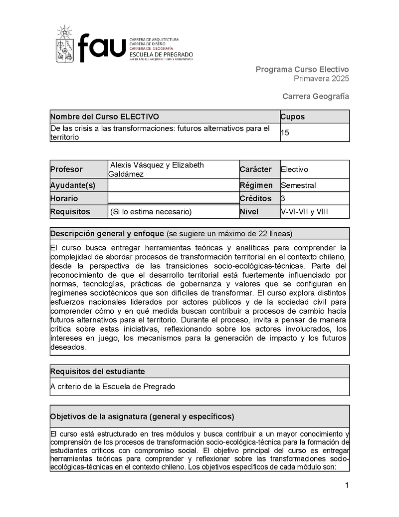 AUG60053-1 Electivo de especialización: De las crisis a las transformaciones socioecológicas: futuros alternativos para el territorio 2025, Segundo Semestre