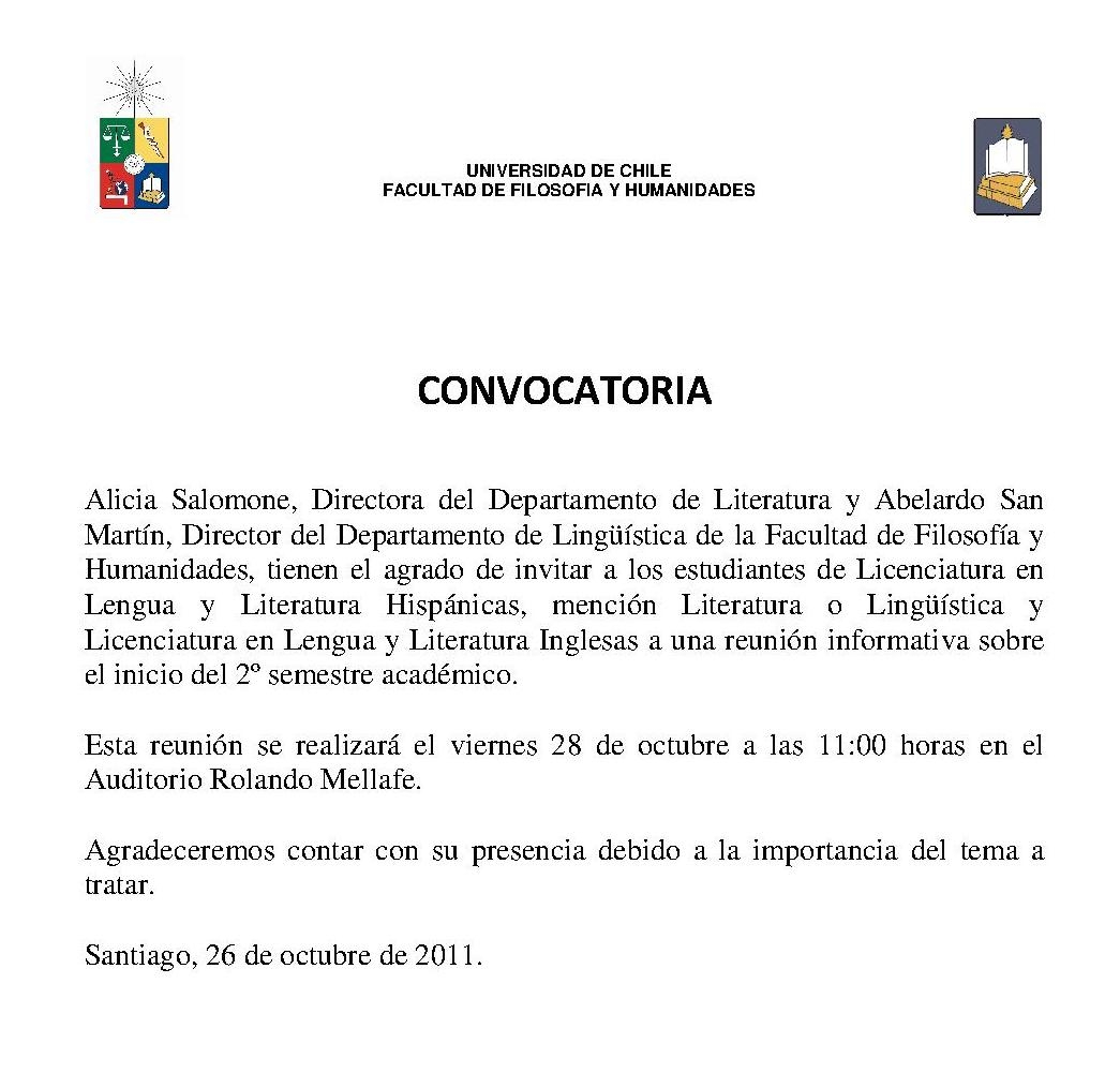 Se convoca a todos los estudiantes de la Licenciatura en Filosofía a un Claustro Triestamental a realizarse el día Lunes 7 de Noviembre a las 15 hrs. en el auditorio Rolando Mellafe, para conversar en torno a la realización del 2º semestre.