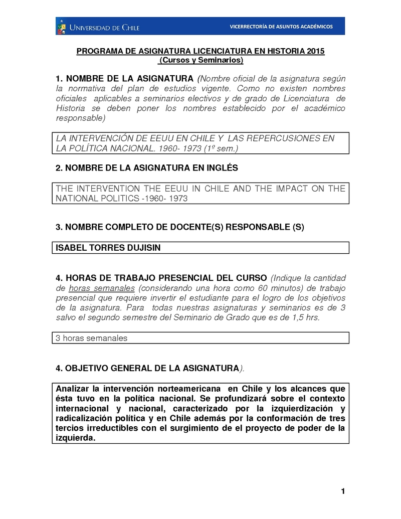 386301SE174-1 La intervención de EEUU en Chile y las repercusiones en la política nacional 1960-1973 2015, Primer Semestre