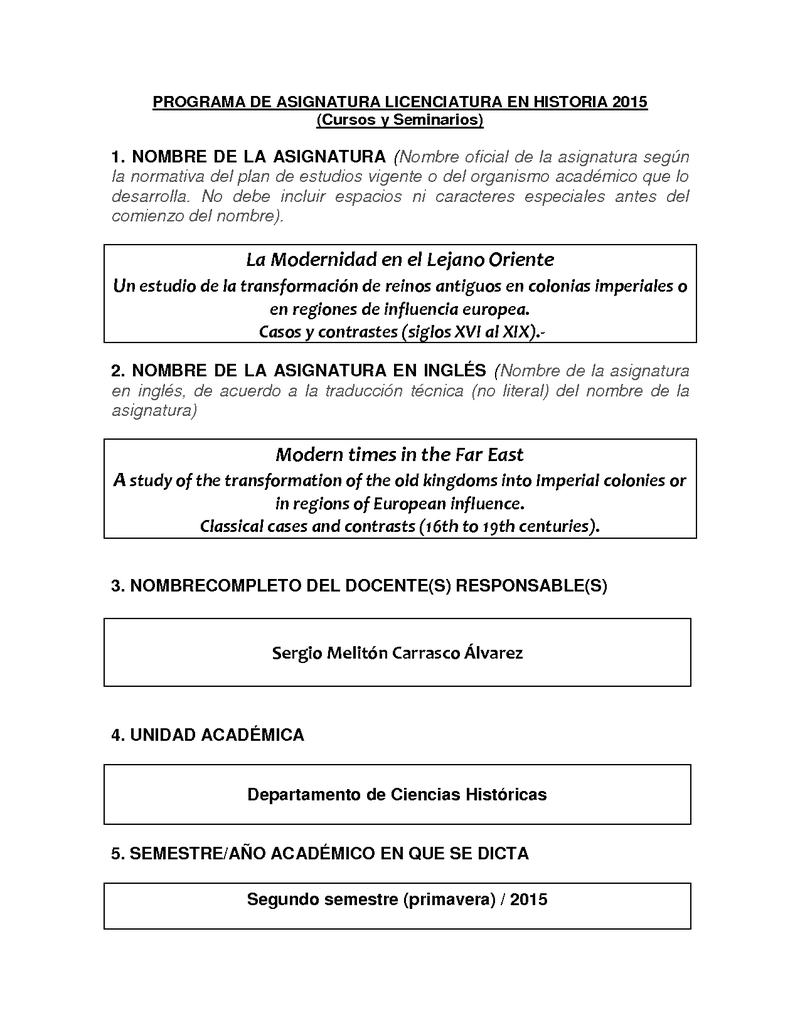 386301SE180-1 La Modernidad en el Lejano Oriente:Un estudio de la transformación de reinos antiguos en colonias imperiales o en regiones de Influencia Europea. (S. XVI al XIX) 2015, Segundo Semestre