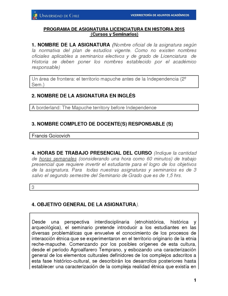 386301SE182-1 Un area de frontera: el territorio mapuche antes de la independencia 2015, Segundo Semestre