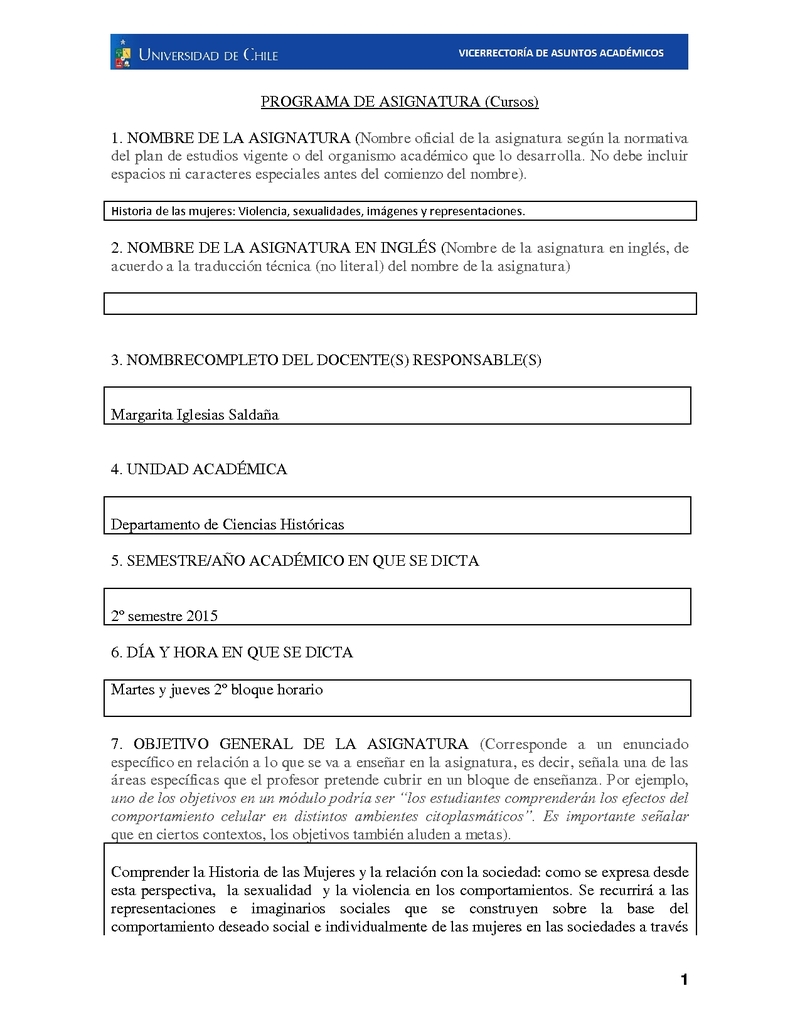 386301SE190-1 Historia de las Mujeres: Violencia, Sexualidades, Imágenes y Representaciones 2015, Segundo Semestre