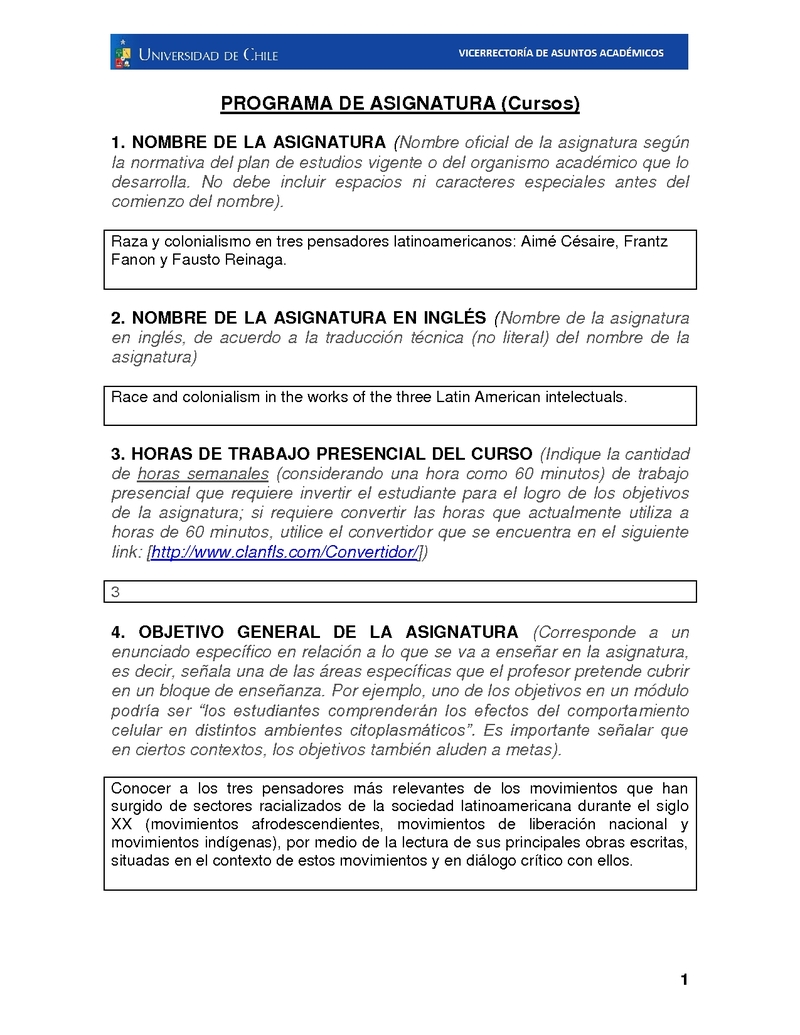386301SE191-1 Raza y Colonialismo en Tres Pensadores Latinoamericanos: Aimé Césarie, Frantz Fanon, Fausto Reinaga 2015, Segundo Semestre